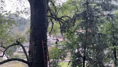 他自行系好安全绳攀爬至树顶后